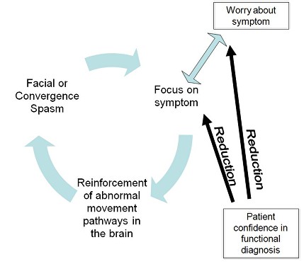 In some patients understanding the diagnosis appears to help by ‘retraining the brain’ which has developed abnormal movement in relation to facial movements (see diagram below).