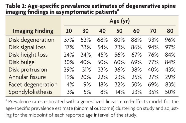 The table below is a synthesis of all the studies that have looked at degenerative spine changes in healthy asymptomatic people with no back or neck pain. These findings are really common!
