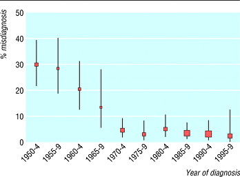 Reassuringly however, studies that have looked at how often neurologists get the diagnosis wrong have tended to agree (at least in the last 30 years) that the proportion of patients in whom the diagnosis turns out to be incorrect later on is about 5%. The graph below is based on 27 studies and nearly 1500 patients followed up for an average of 5 years. It shows how the diagnosis has become more accurate over the years.